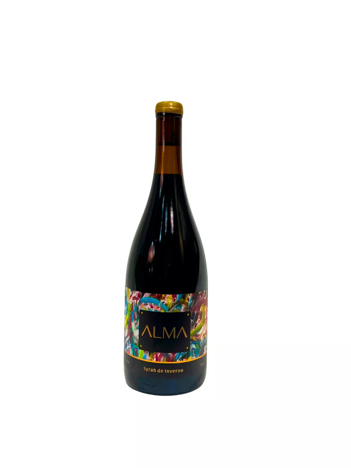 Esse rótulo tem como imagem de fundo uma tela óleo pintada pela nossa enóloga Gabriela após o nascimento do seu primeiro filho, muito colorido e cheio de movimento, em um fundo preto e dourado elegante e de personalidade. Essa tela é o elemento comum em nossos vinhos com a uva Syrah.